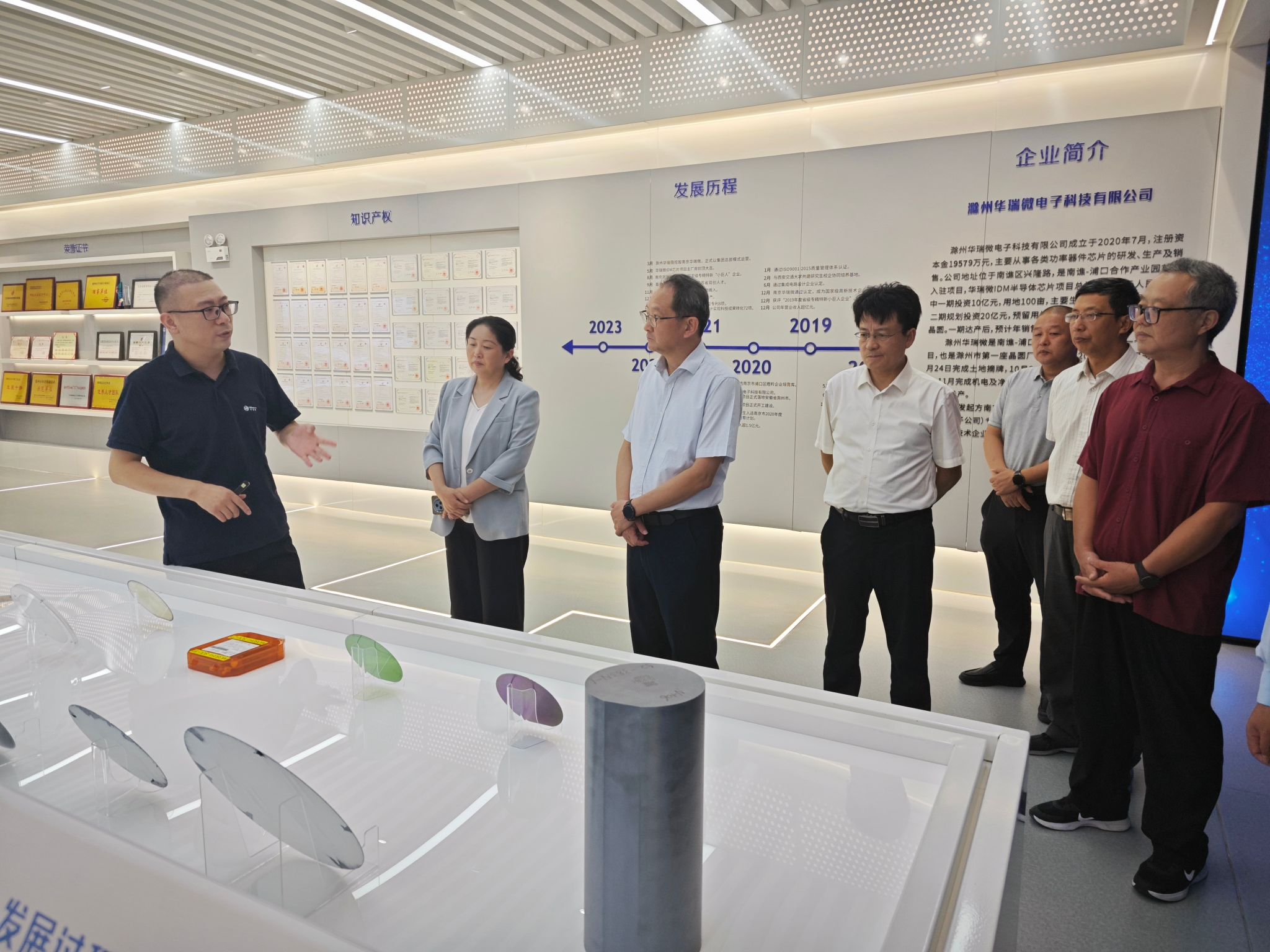 18日下午,陈飏、许雪峰一行来到滁州华瑞微电子科技有限公司,在华瑞微主要领导的陪同下,参观了企业的生产车间、研发中心以及产品展示区等区域,详细介绍了企业的发展历程、核心业务、技术创新成果以及未来战略规划。在参观过程中,陈飏、许雪峰一行深入了解了企业的现代化生产流程、先进的制造工艺以及对人才的需求特点,与企业主要领导就人才培养、产教融合等事宜进行了深入探讨,为后续的校企合作提供了更明确的方向。