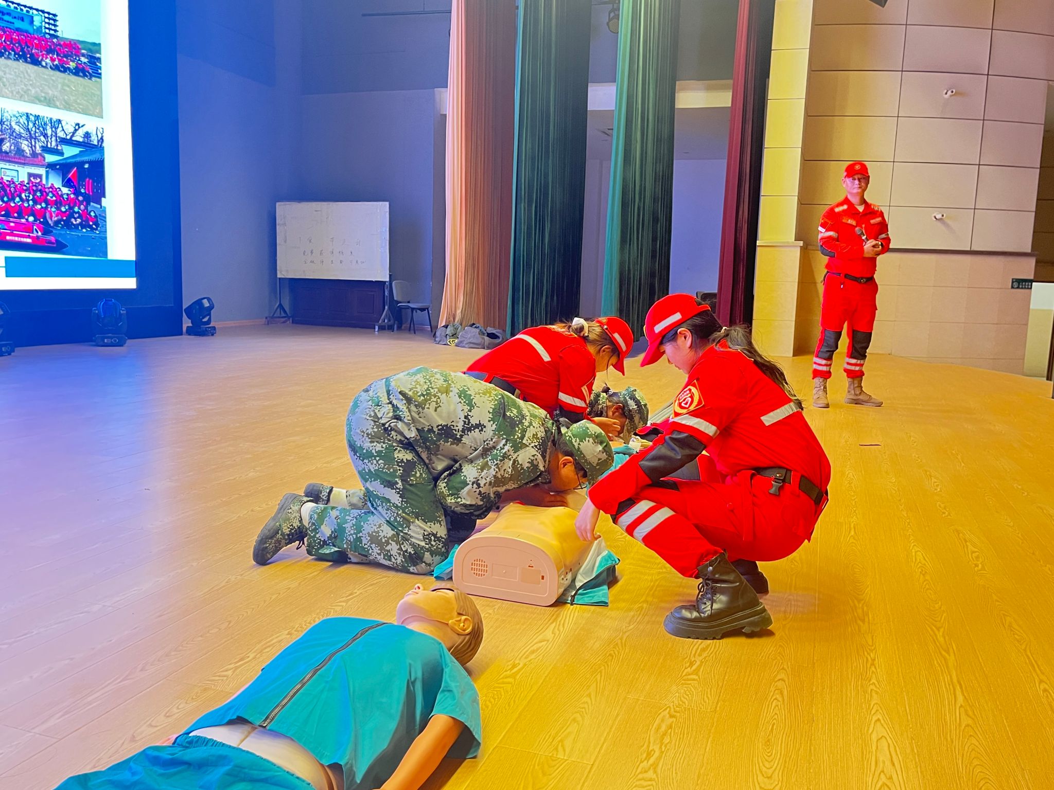 下午3时,急救技能培训在学校大礼堂火热开展。活动特邀滁州市青年志愿者协会的急救老师授课。
