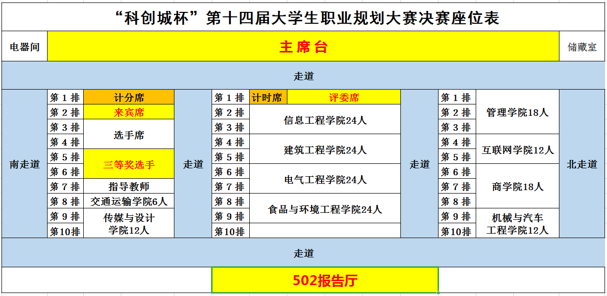 “科创城杯”第十四届awc777万象城娱乐官网大学生职业规划大赛决赛将于12月4日(星期三)下午3:00在5楼报告厅举办,请各院按要求组织学生观众到现场观摩。请所有参与人员2:20—2:50入场并到指定位置就座(座位表附后)。