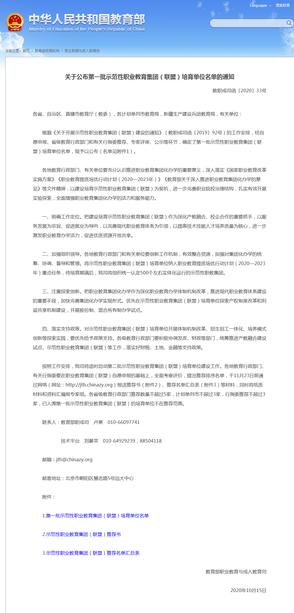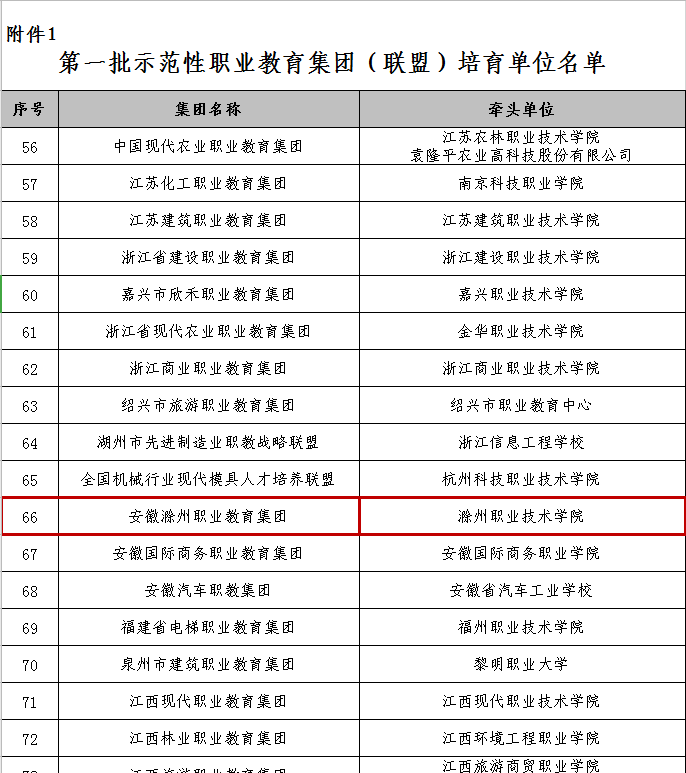 日前,根据《关于开展示范性职业教育集团(联盟)建设的通知》(教职成司函〔2019〕92号)的工作安排,经自愿申报、省级教育行政部门和有关行指委推荐、专家评审、公示等环节,教育部职业教育与成人教育司发布了“第一批示范性职业教育集团(联盟)培育单位名单”,包括安徽滁州职业教育集团、联想职业教育集团、北京交通职业教育集团等150家国家示范性职业教育集团。