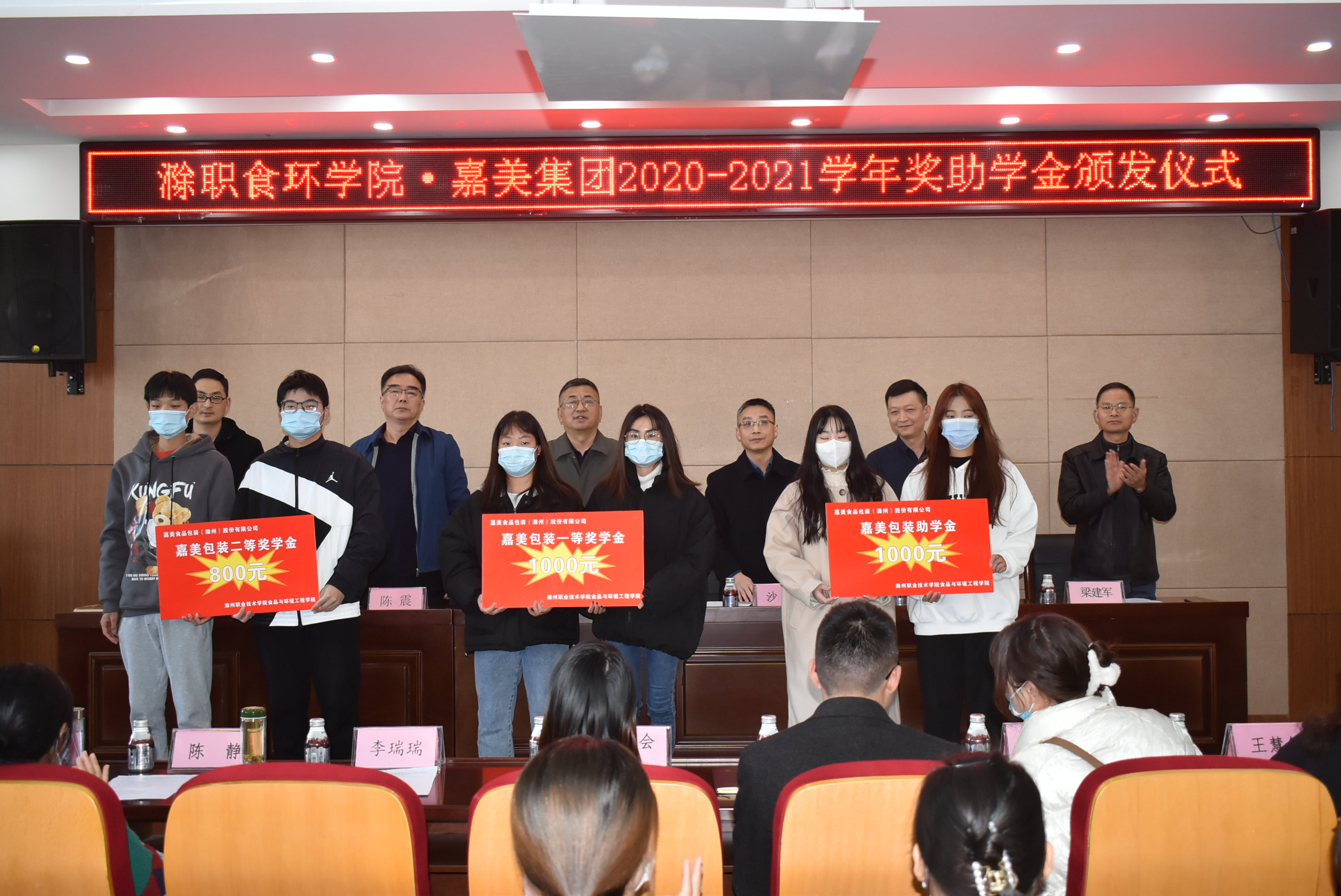 11月22日下午,食环学院与滁州职教集团理事单位嘉美食品包装(滁州)股份有限公司联合举行企业奖、助学金颁发仪式。awc777万象城娱乐官网党委委员、校长助理、招生就业处处长穆松应邀出席颁发仪式,食环学院党总支书记陈震、院长梁建军,嘉美集团生产行政总监沙荣、综合营销群总经理甘洪、人事经理管伟,食环学院部分教师、辅导员,20嘉美食品班学生等参加了颁发仪式。