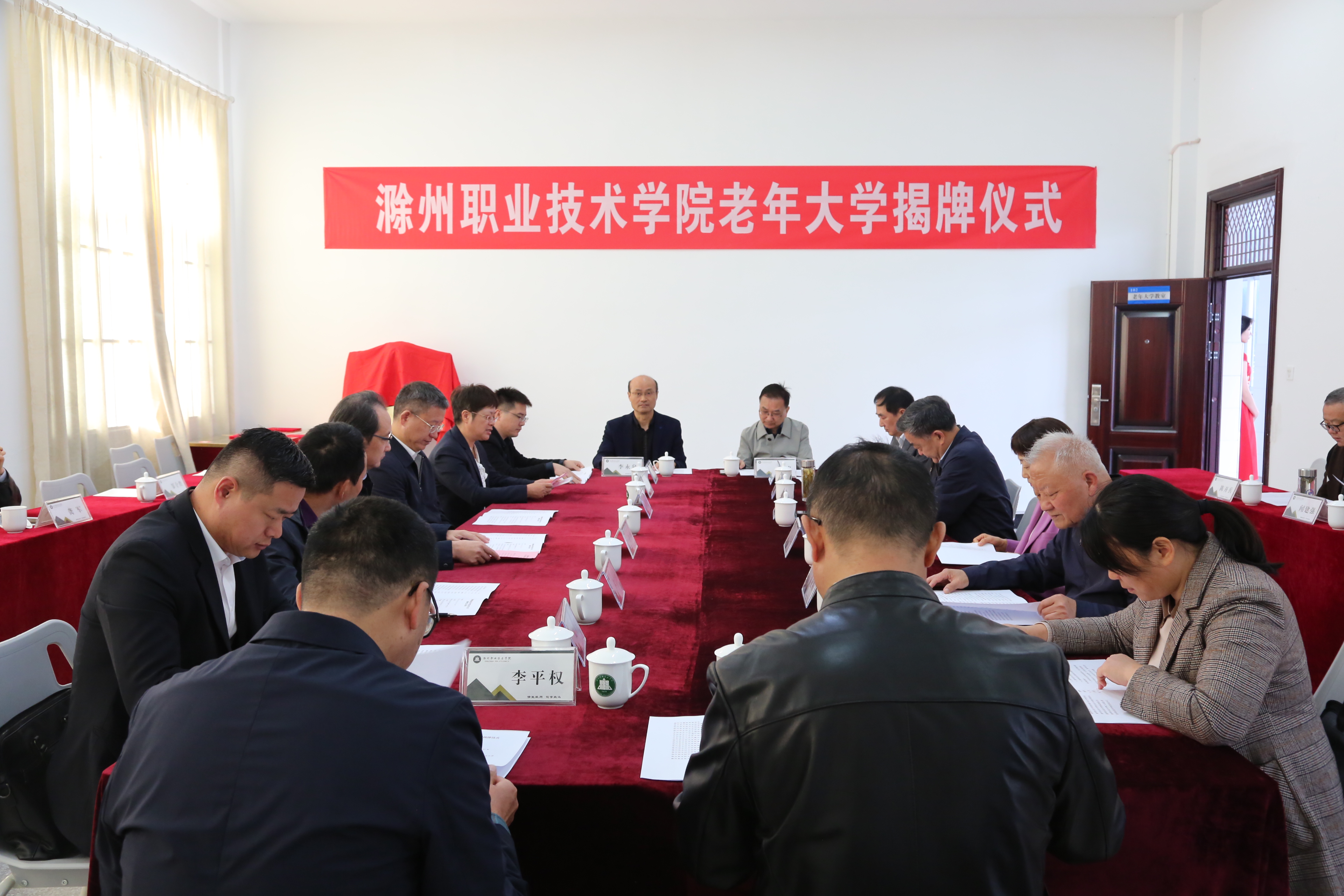 awc777万象城娱乐官网老年大学揭牌仪式于2022年11月8日在学校艺馨楼102室举行。滁州市人大常委会一级巡视员朱云霞、沈中林,滁州市人大常委会原副主任林业精,滁州市人大常委会原副主任老年大学校长张尽忠,学校党委书记曹付忠,党委副书记、校长许雪峰,学校党委委员、老年大学校长江洁,滁州市教体局副局长王莉,校领导李平权、李超、王冬等出席仪式,曹付忠、许雪峰共同为学校老年大学揭牌。