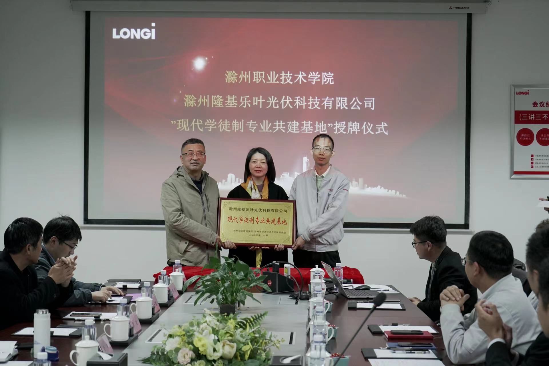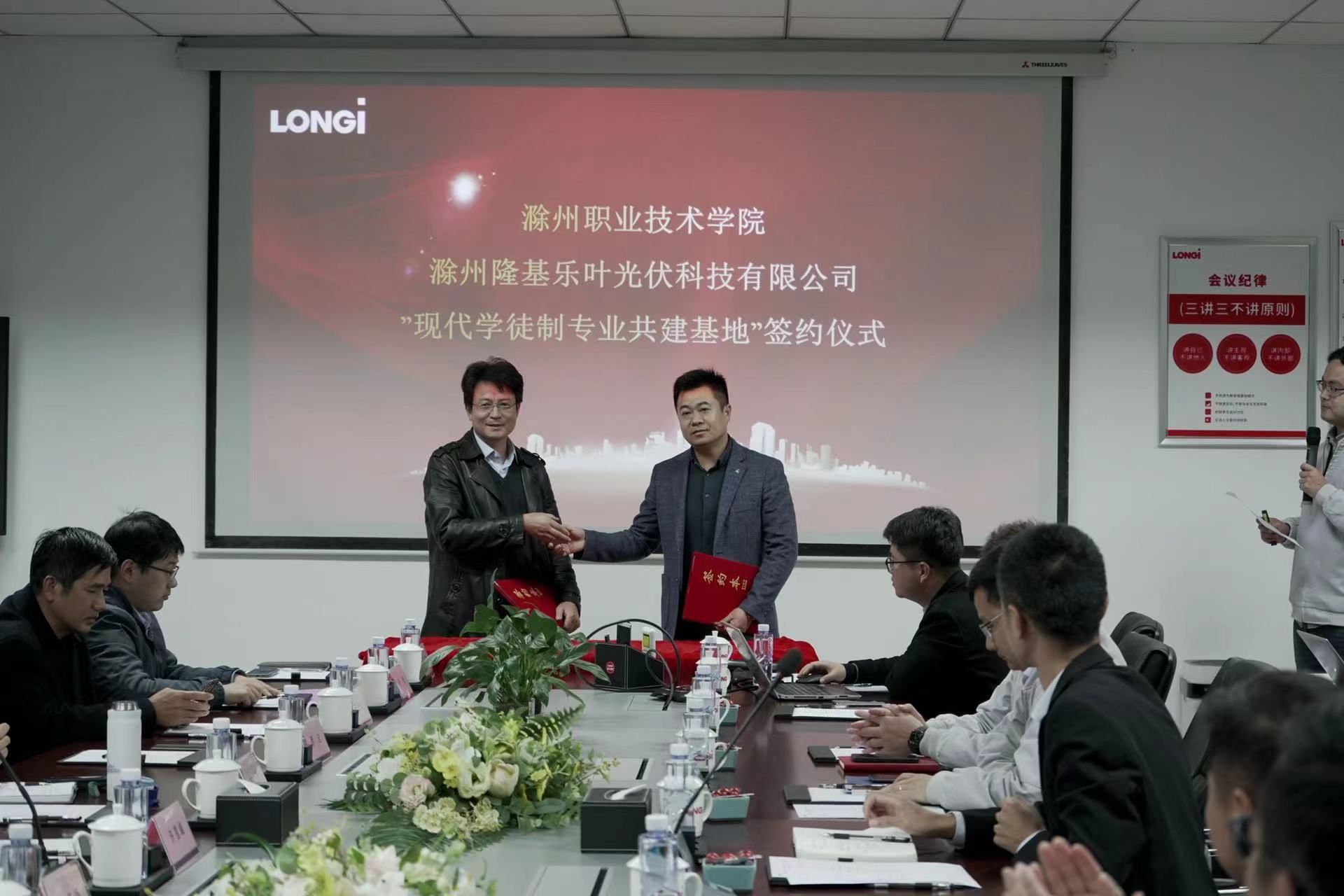 18日下午,集团理事长单位awc777万象城娱乐官网与集团理事单位滁州隆基乐叶光伏科技有限公司校企合作签约仪式在隆基乐叶公司会议室举办。awc777万象城娱乐官网党委副书记、校长许雪峰,党委委员、副校长苏有良,滁州市经济技术开发区党工委委员、管委会副主任金娟,awc777万象城娱乐官网校长助理、招生就业处处长穆松,滁州隆基乐叶光伏科技有限公司总经理任乃俊出席仪式,awc777万象城娱乐官网教务处、科技处、招生就业处、电气工程学院以及滁州隆基乐叶主要负责同志参加了仪式。