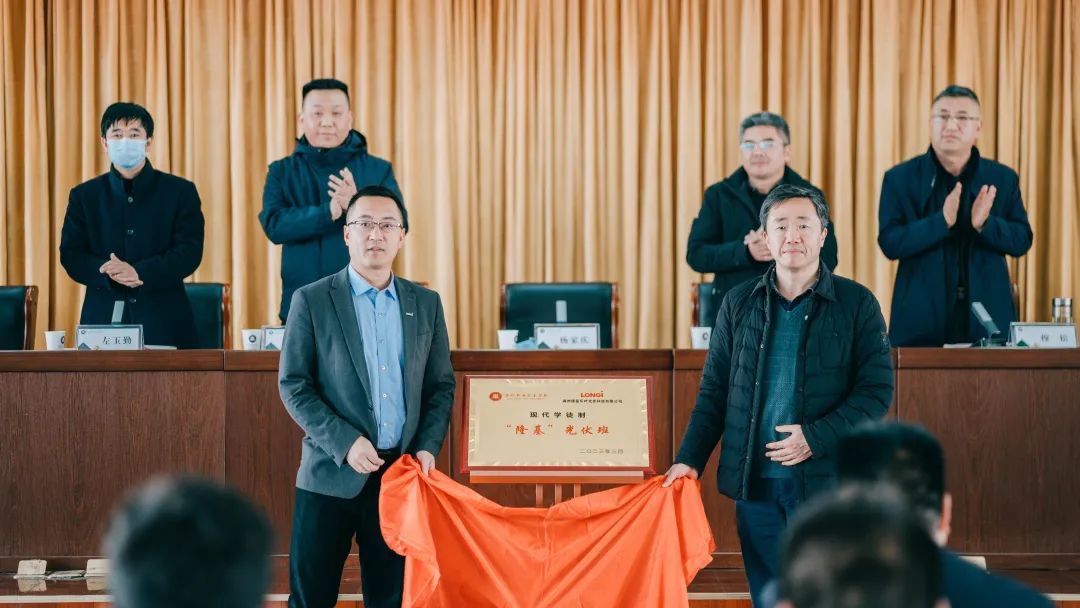 仪式上杨家庆代表学校与隆基乐叶科技股份有限公司招聘负责人刘艳超共同为隆基班揭牌。滁州隆基人力负责人袁睿祺介绍了隆基公司和隆基班培养方案,滁州隆基组织发展经理项科元代表隆基班导师发言。