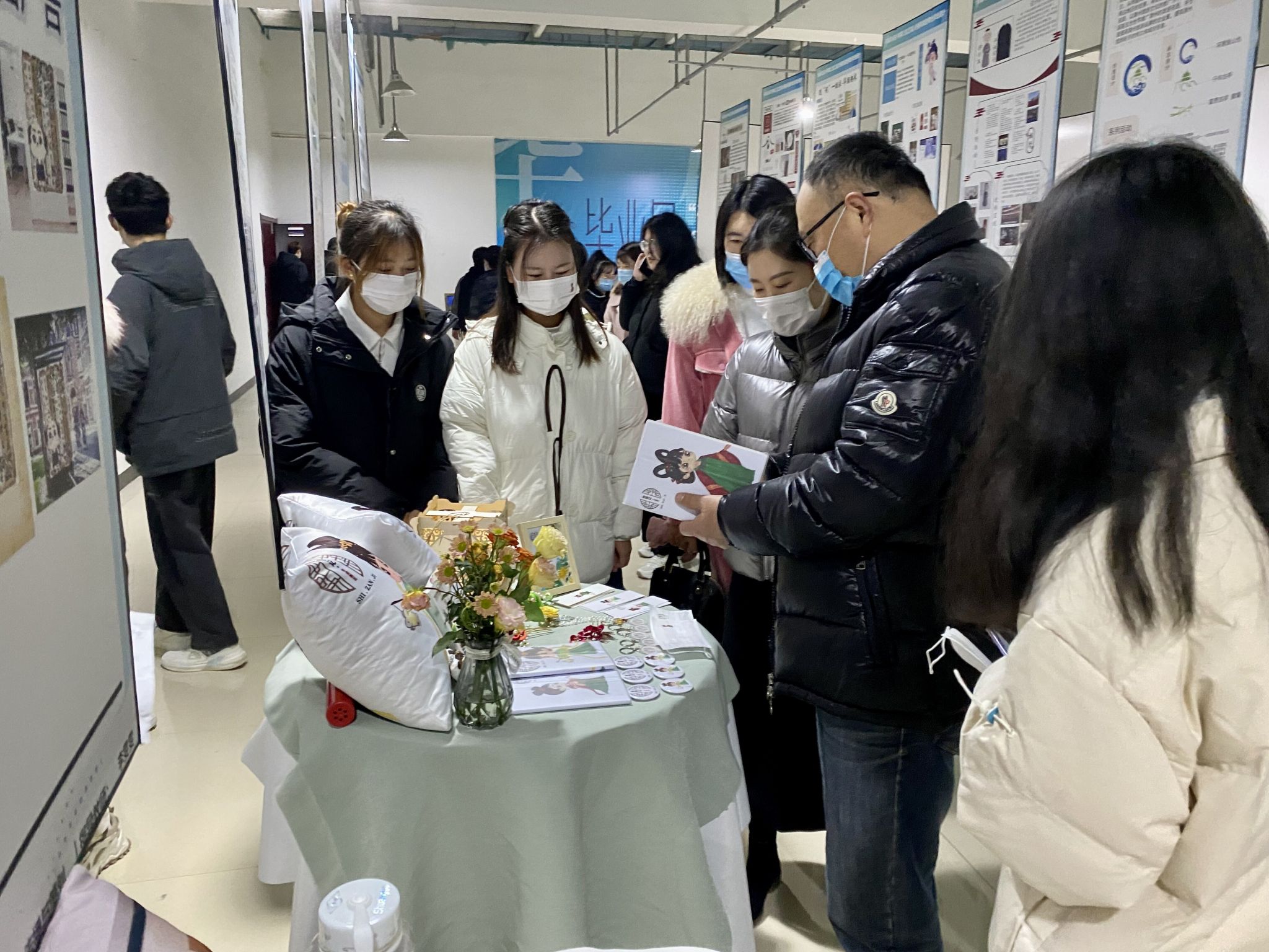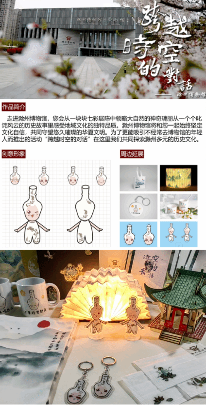 “作品以滁州博物馆馆藏元景德镇窑和青花梅花长颈瓶为创作原型,衍生出‘老话新说’的IP形象设计‘梅花花’,塑造了活泼可爱的卡通形象,融入‘青花梅花长颈瓶’瓶身的花纹做成元素。展现了滁州市地方文化的特色,‘梅花花’性格热情好客,具有亲和力,同时策划了10项线上线下联动活动,欢快的邀约各地宾朋走进滁州博物馆。”参展学生张博热情洋溢的说。