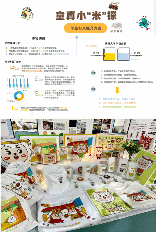 “我们小组设计作品题目为‘童真小米探’,以乡村农产品品牌振兴的社会价值为导向,通过前期分析调研,定位媒介组合策略,围绕‘城市绿洲’与‘乡村同行’,列出13项乡村振兴的可行性活动方案,并原创整套农产品形象提升方案,推广我们中国乡村的特色农产品。”参展学生李敏、李洋介绍。