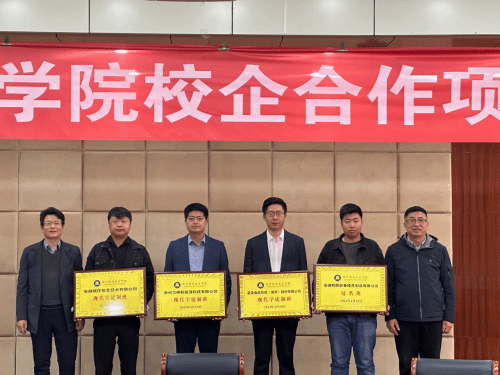 苏有良、穆松代表学校向签约企业颁发牌匾,穆松代表学校与蔚来汽车科技(安徽)有限公司、滁州力神新能源科技有限公司等12家企业签订13个合作项目。