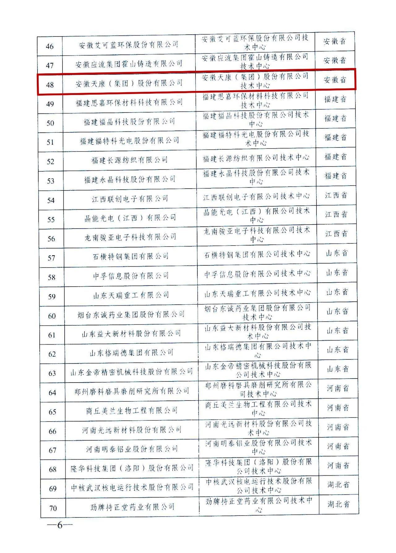 日前,国家发展改革委、科技部、财政部、海关总署、税务总局等五部门正式发布了第29批新认定国家企业技术中心名单,集团副理事长单位安徽天康(集团)股份有限公司技术中心被认定为国家企业技术中心。
