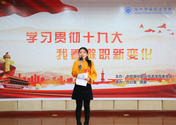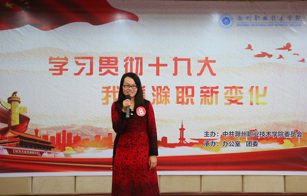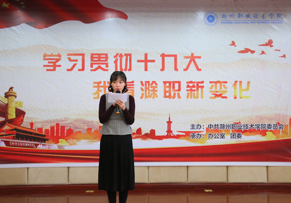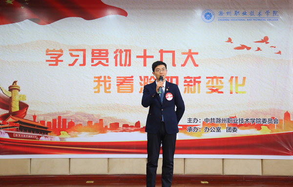 为全面深入学习宣传贯彻党的十九大精神,把学院广大师生思想统一到党的十九大精神上来,把力量凝聚到党的十九大确定的各项任务上来,学院组织开展“学习贯彻十九大我看滁职新变化”主题演讲比赛。学院党委副书记、院长李柱梁,院党委副书记、纪委书记刘树俭,院党委委员、组织人事处处长陈学军,各党总支书记及党员代表出席比赛现场。