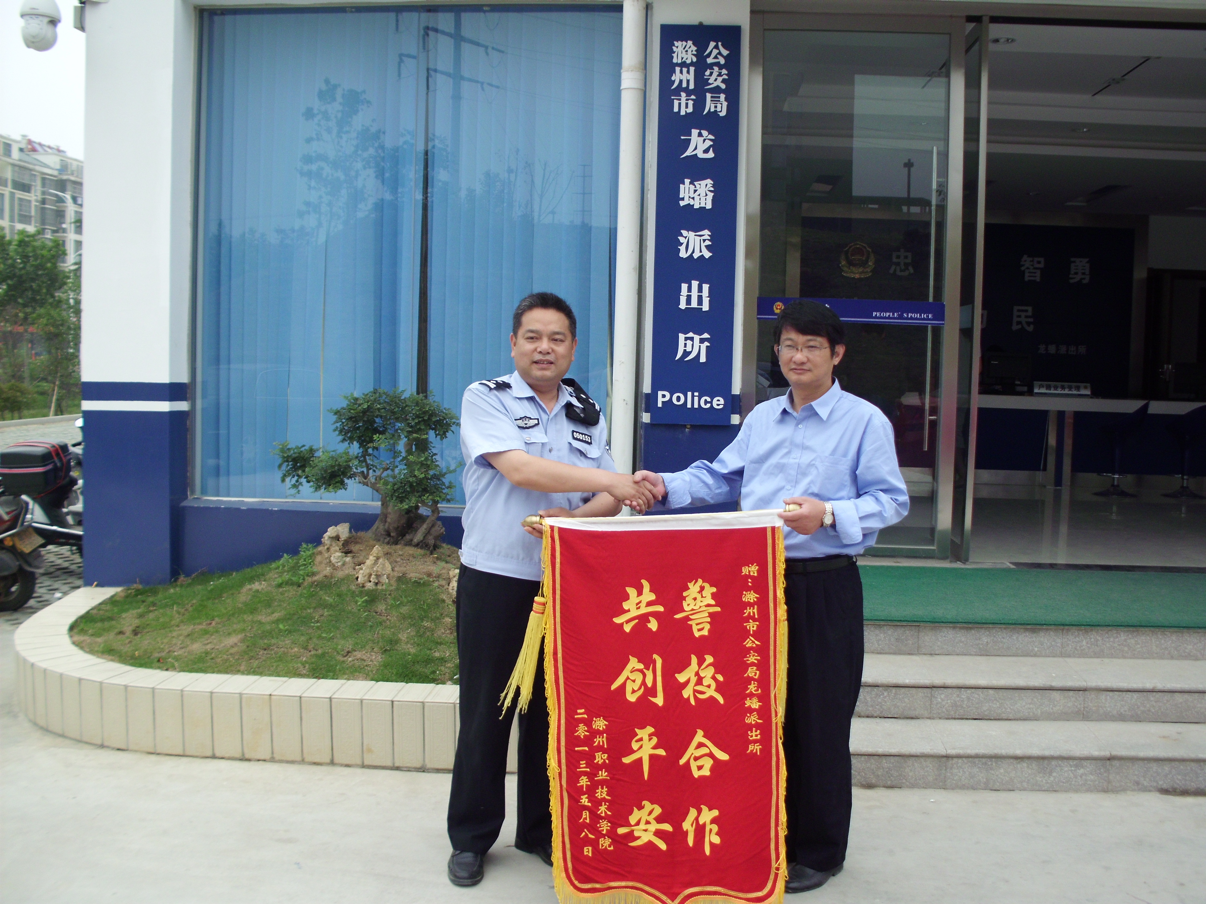 ,学院保卫处前往滁州市公安局南谯分局龙蟠派出所赠送锦旗,感谢他们在确保校园平安做出了大量工作,为我院师生挽回了经济损失,下步警校将加强合作,共创平安校园。(文