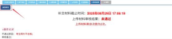考生上传材料审核不通过,页面显示上传材料审核结果为“未通过”,在补交材料截止时间内,根据系统提示要求修改信息,点击“返回修改”,可返回修改填报信息。