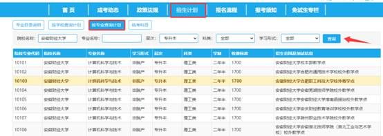 点击 “专业查询”按钮,进入专业查询计划界面。选择要查询的层次、学习形式、科类、专业名称(手动输入),点击“查看”按钮。系统将会显示相应的查询结果。
