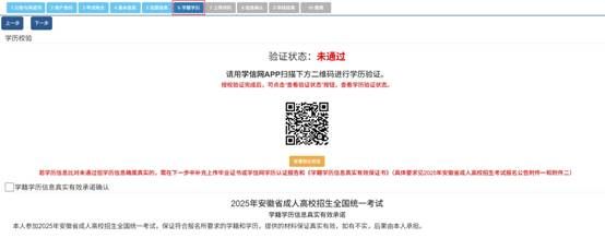 若报考层次为“专升本”,需使用“学信网”App,扫描二维码授权学历验证,授权完成后,点击“查看验证状态”,查看学历验证状态; 学历校验完成后,勾选“学籍学历信息真实有效承诺确认”,确认无误后,点击左上方“下一步”,进入上传材料。