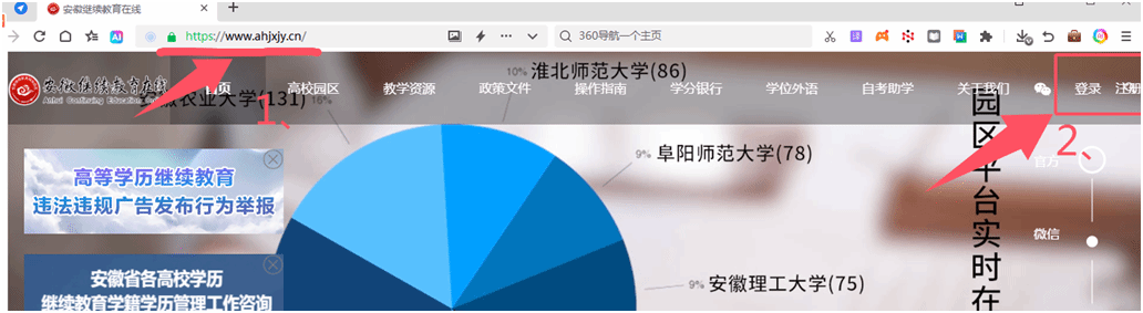 使用360浏览器,在网页的地址栏输入网址:https://www.ahjxjy.cn,进入“安徽继续教育在线”平台主页,如图1所示。