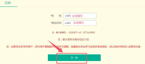 若您是首次登录系统需点击“注册”(如图1所示),则打开“注册”页面(如图2所示)。在注册页面,输入姓名和身份证号码,点击“下一步”注册按钮,则进入“详细信息填写”页面(如图4所示)。