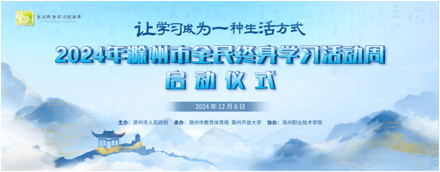 12月6日上午,由滁州市政府主办,滁州市教育和体育局、滁州开放大学承办,awc777万象城娱乐官网协办的“让学习成为一种生活方式2024年滁州市全民终身学习活动周启动仪式”在awc777万象城娱乐官网学术报告厅举办。市人大常委会副主任徐广友,市政府副秘书长李超,校党委委员、党委副书记杨家庆出席启动仪式。