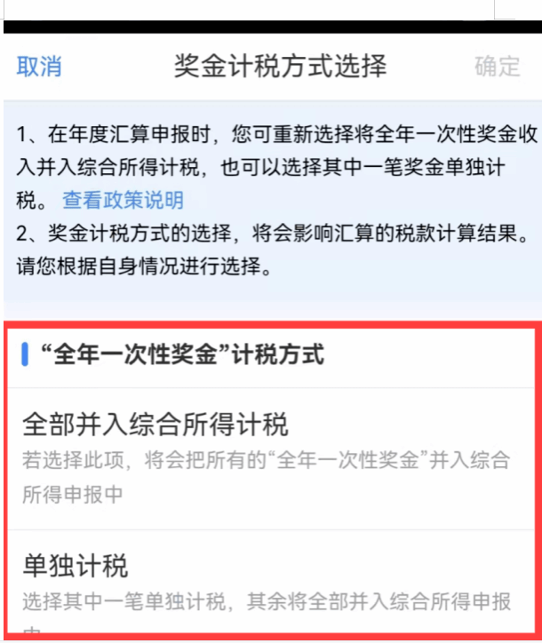 因为不同计税方式会导致税额不同,您在正式提交申报前可比较选择最优计税方式。(职工可以根据实际情况选择合适的全年一次性奖金纳税方式,对于专项附加扣除项目较多的职工可以考虑将全年一次性奖金纳入综合所得进行汇算清缴,)