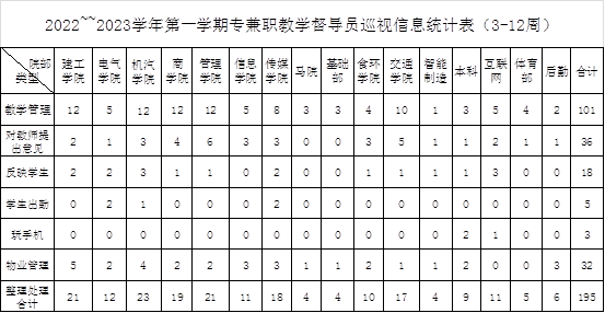质量管理中心教学督导科每学期组织专兼职教学督导员进行开学第一周专项教学巡视和每周日常教学巡视,通过巡视获得关于教学一线的教学信息,3-12周巡视30余人次,获得相关教学信息如下表所示。