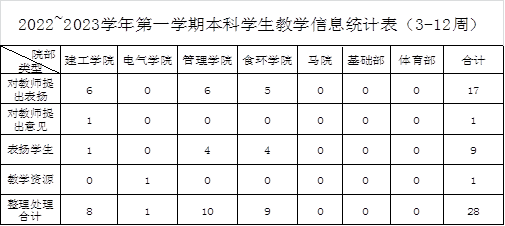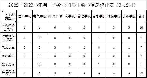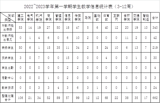 本学期从第3周开始,学生教学信息继续坚持每周收集一次,在线收集包括扩招和本科学生在内的“学生教学信息员反馈意见表”,及时汇总反馈给相关部门处理和汇报领导。从新生入学后,第一时间与各教学院部一起推选产生了115名新生教学信息员,建立了新生教学信息员队伍,并于9月29日开始参与教学信息反馈工作。第3-12周,共收集处理学生信息员教学信息718条,其中普招662条,社招28条,本科28条,具体情况见下表: