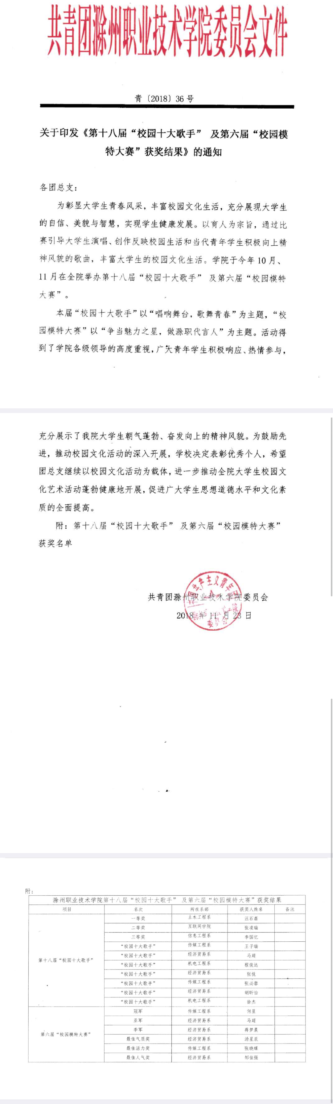 关于印发《第十八届“校园十大歌手” 及第六届“校园模特大赛”获奖结果》的通知