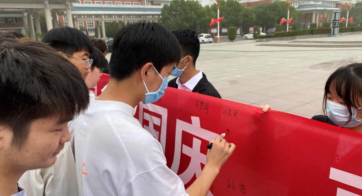 当国歌响起时,全体青年学生保持整齐队列,朝五星红旗行注目礼,以最激情高昂的状态跟唱国歌,在活动结束时,青年学生主动向前参加“同心庆国庆,喜迎二十大”的横幅签字活动。