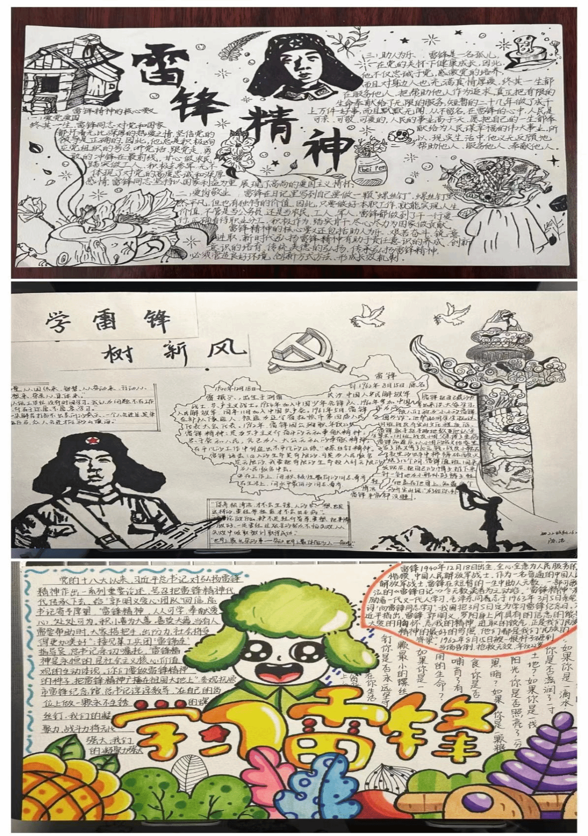 各班充分利用黑板报、手抄报这块宣传阵地,对雷锋的生平事迹进行了全方位的报道,通过介绍雷锋的生平、雷锋名言录、介绍雷锋的感人事迹、再现雷锋日记等方式让同学们充分了解雷锋,学习雷锋,传承雷锋精神。