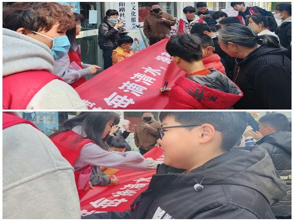 在活动现场,光伏2班班长翟昱皓向小学生普及了世界节水日相关知识和水资源的宝贵性,并通过PPT讲解和视频播放的形式进行宣传,让小朋友们深刻认识到水资源的稀缺性,并传播了许多节约水资源的知识。活动中进行互动提问,并通过与水有关的优美诗句朗读积极动员小朋友们参与活动,并发放相应的小礼品以资鼓励,有效地加深了小朋友们对于水资源缺乏问题的认识,增强了节水意识。随后,团支部成员现场组织了“珍惜水资源,美化水环境,拒绝水污染”为主题的横幅签名活动,鼓励小朋友及家长、社区居民进行横幅签名,表达对水资源的爱护和珍惜,并号召大家从身边小事做起,为地球上的可持续发展贡献力量。