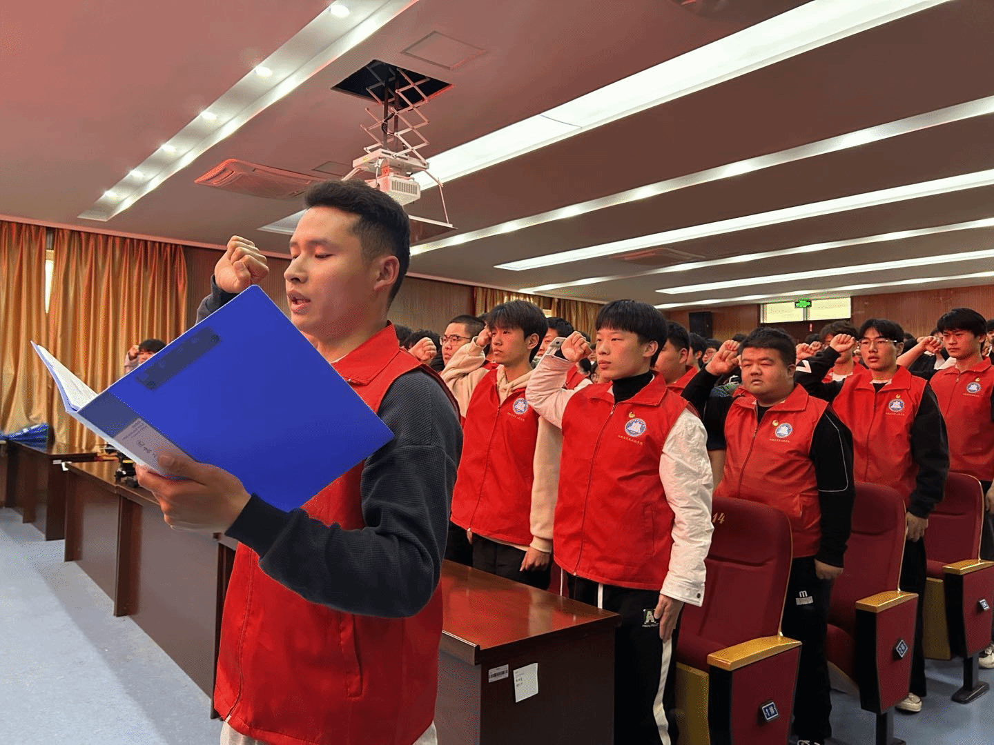 会议第三项,学生代表支道辉带领全体志愿者起立宣誓。仪式上,青年志愿者们佩戴团徽,面对志愿队旗做出庄重承诺。铮铮誓言,展现了awc官网青年志愿者们积极投入于志愿服务的热忱之心。