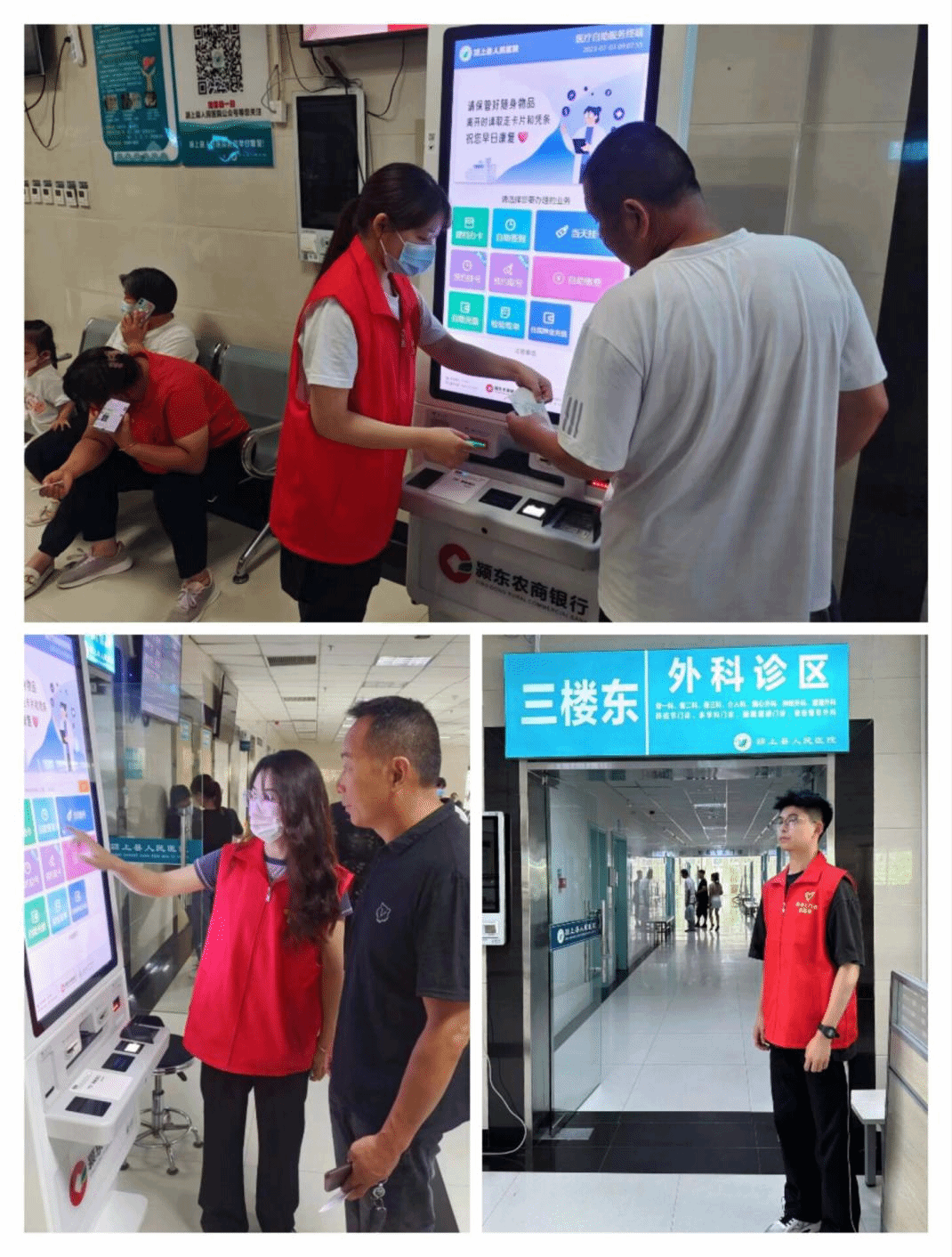 在县医院,我院青年志愿者们身穿红色小马甲开始了志愿服务工作。在预检分诊、门诊还有住院大厅各个部门为前来就诊的群众细致的解答相关咨询问题、并对就诊人员进行流感防控知识宣教、指导群众正确佩戴口罩、协调就诊排队秩序及间隔1米以上等具体措施,高效快捷的协助患者完成相关就诊流程。