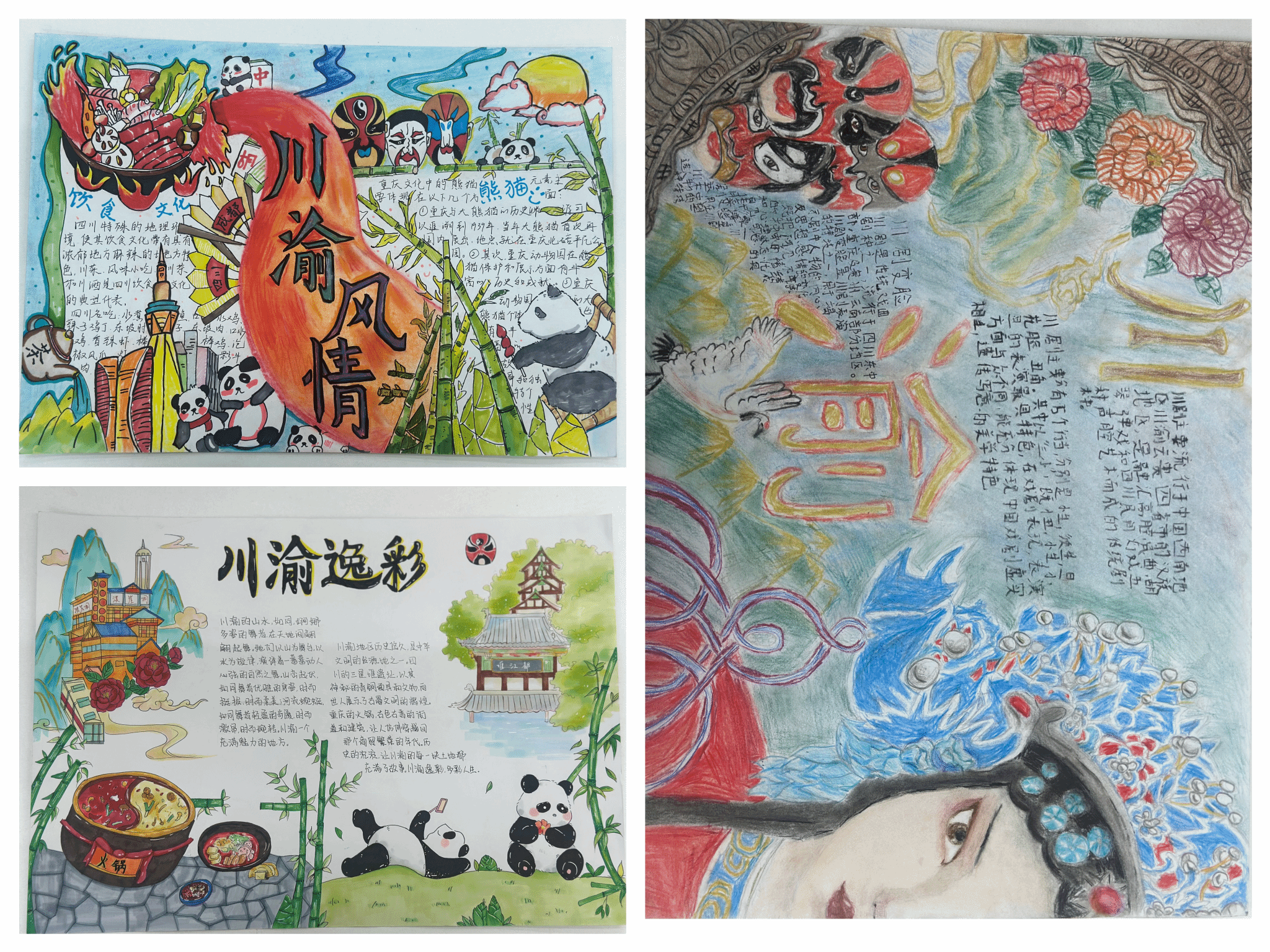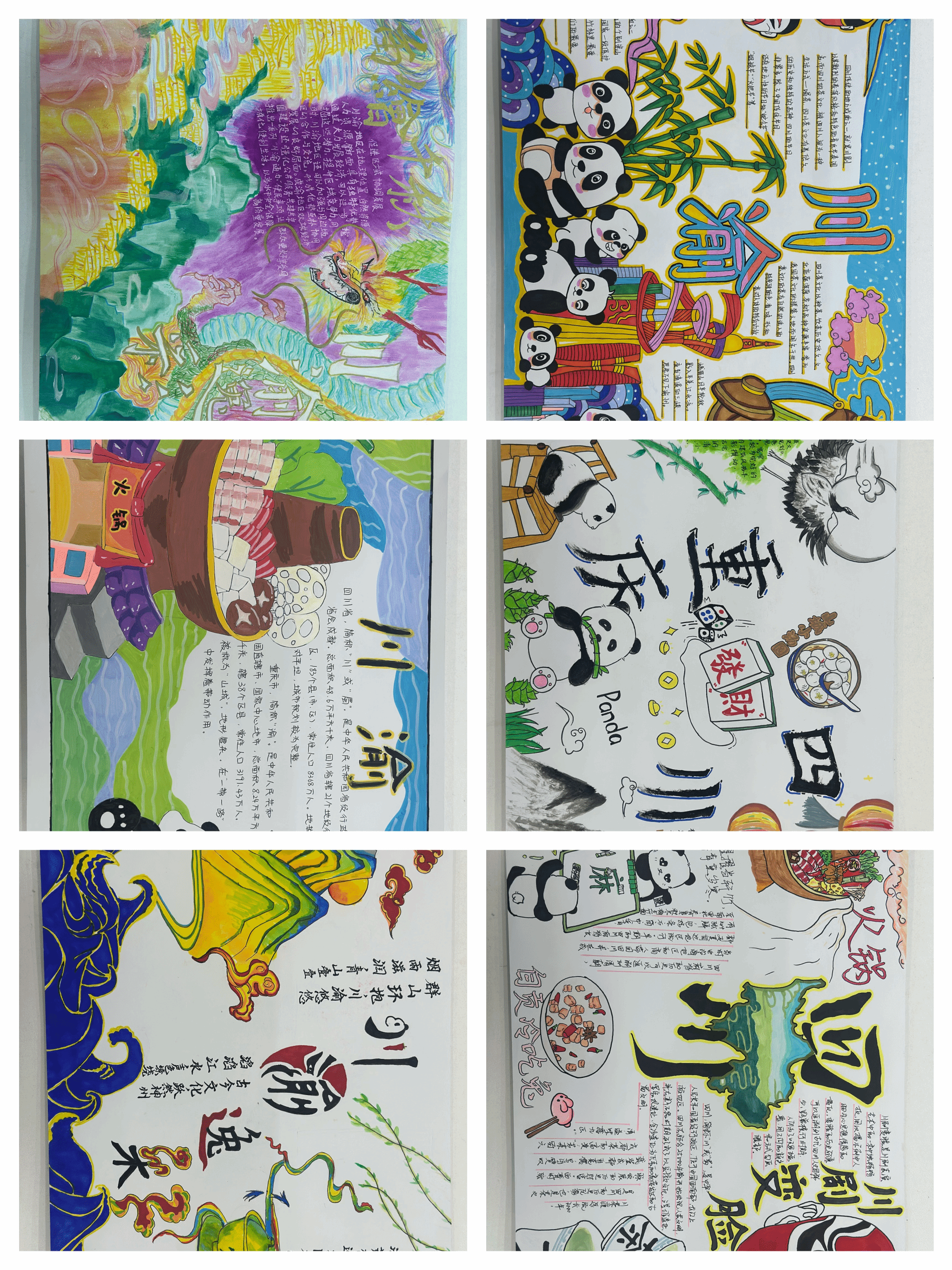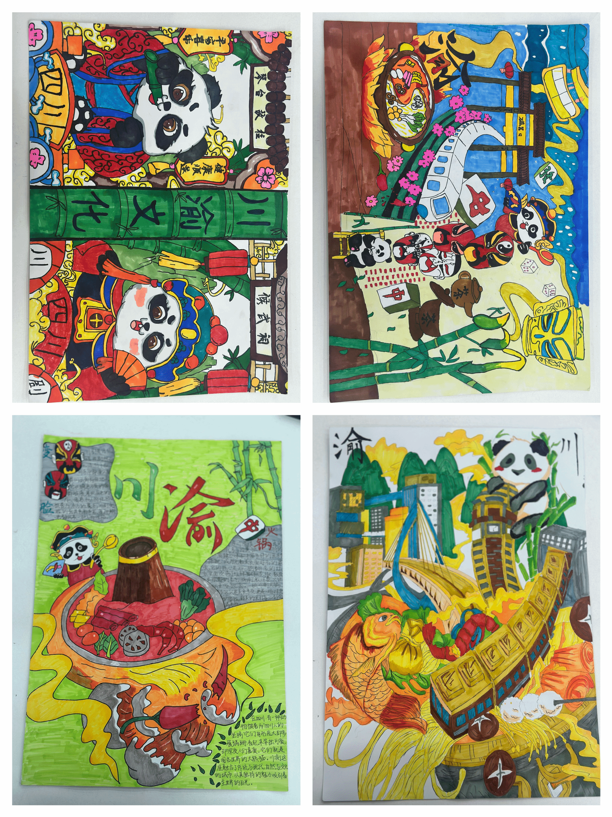 活动伊始,大家怀揣着对川渝文化的热爱,拿起手中的画笔,开启了一场创意与文化的交融之旅。在画卷中,川渝的元素跃然纸上。憨态可掬的熊猫或嬉戏玩耍,或悠然自得地啃着竹子,那黑白相间的皮毛被描绘得栩栩如生。色彩斑斓的戏剧脸谱也成了同学们描绘的重点,每一笔都勾勒出角色的性格特点,展现出川渝戏剧文化的独特韵味。而那些令人垂涎欲滴的美食,如热气腾腾的火锅、香气四溢的串串等,更是以细腻的笔触呈现出了其诱人的模样,仿佛透过画卷能闻到那扑鼻的香气。这些画作不仅是色彩与线条的组合,更是同学们对川渝文化深入理解后的情感表达。