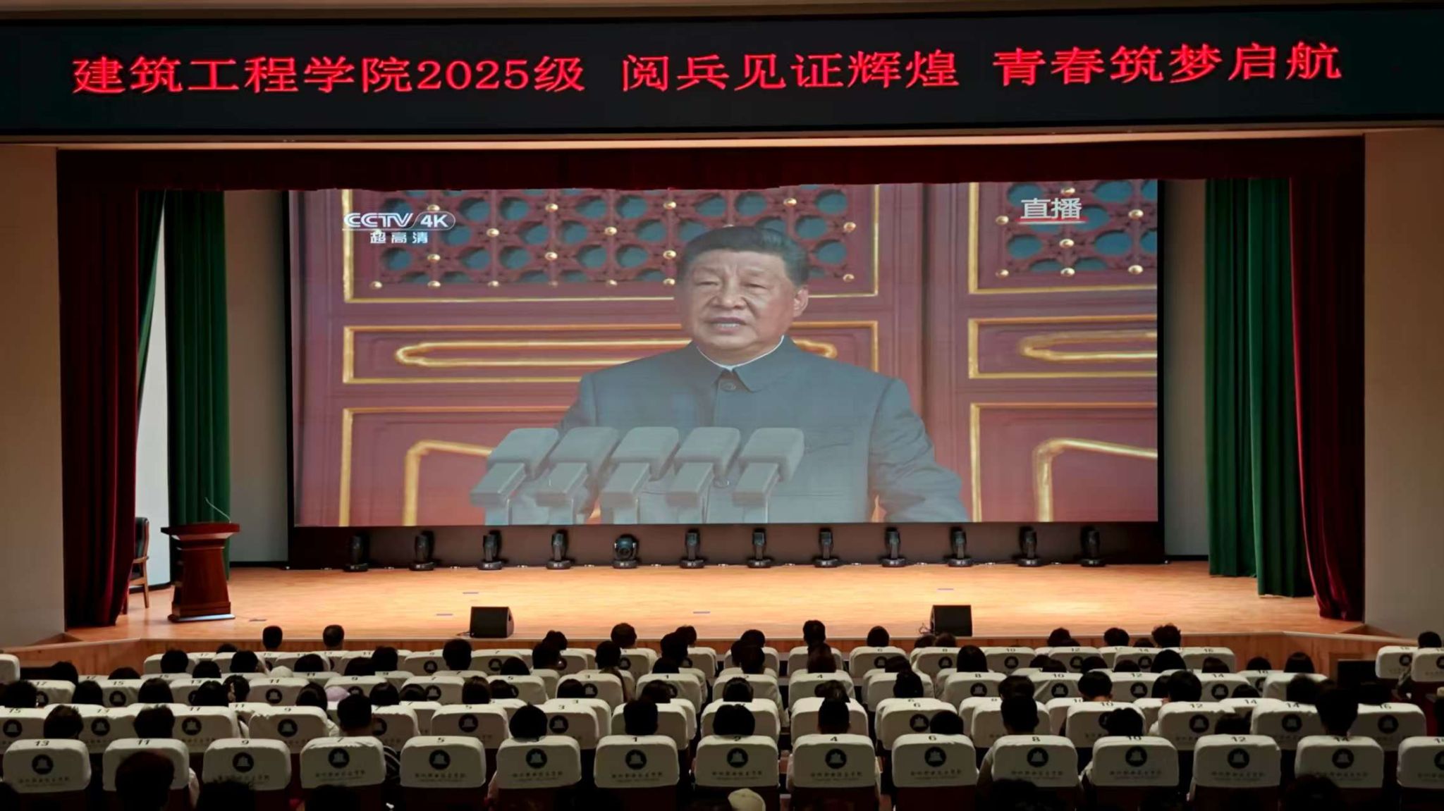 为深切缅怀抗战先烈,弘扬伟大抗战精神,建筑工程学院于9月11日在六号楼报告厅组织大一新生重温九三阅兵活动。