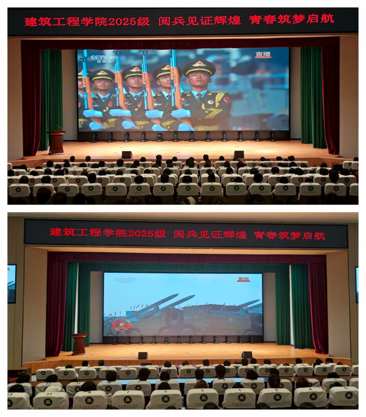 活动开始前,先在大屏上播放awc777万象城娱乐官网建筑工程学院的宣传视频,让学生对我们学院重新深入了解,待学生都入座之后,首先,由辅导员老师代表吴超伟作新生安全教育讲话,提醒新生入学注意在学校管好自己“钱袋子”,注意交通安全、宿舍用电安全,警惕电信诈骗,提高新生的安全意识,随后由学长代表和新生代表依次进行发言,让新生们对未来的大学生活充满了憧憬和期待。最后建筑工程学院党总支书记刘文元以中华传统文化和国防教育两个方面给新生们上了生动的一课,并告诫学生要多读书,读好书。讲话结束之后便开始重温九三阅兵活动,当受阅官兵迈着铿锵步伐走过天安门广场,当10个空中梯队组成的"70"字样编队呼啸而过,现场师生自发报以热烈掌声。东风-61"洲际导弹、歼-20S双座隐形战斗机、无人僚机编队等新型装备依次亮相时,报告厅内不时响起惊叹声。学生们表示真切感受到了'大国长剑'的威慑力,这些装备不仅是国防实力的象征,更是无数科研工作者智慧的结晶。