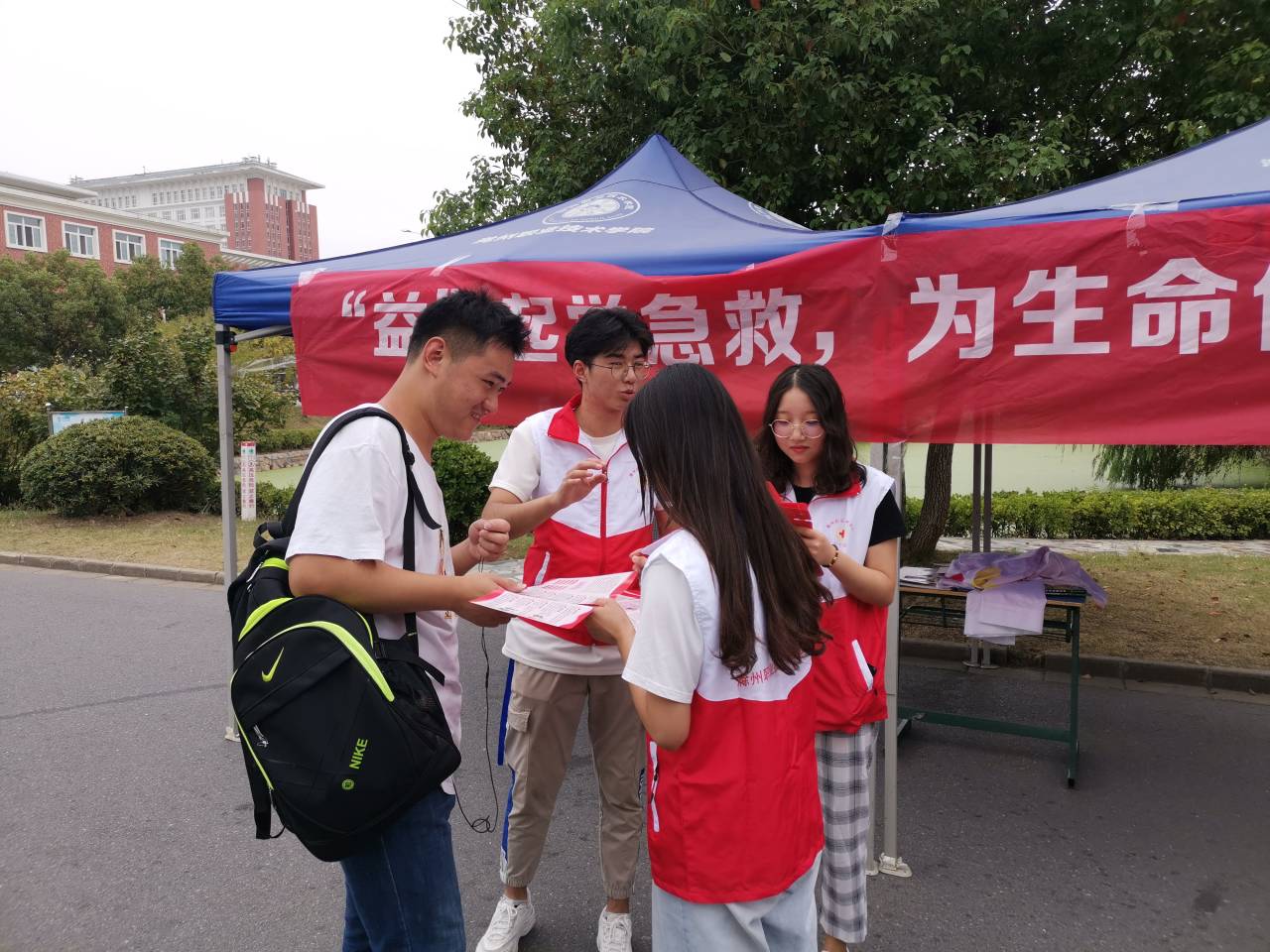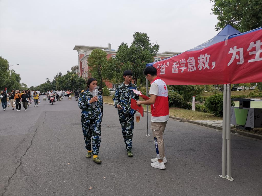 应急救护是人因各种突发意外发生呼吸骤停或猝死时对其采取的急救措施。awc官网红十字会志愿者本着进一步弘扬人道、博爱、奉献的红十字精神,让同学们更多地学习紧急时刻采取的急救措施,于9月25号中午,在awc官网女生宿舍一号楼前开展摆摊宣传活动。