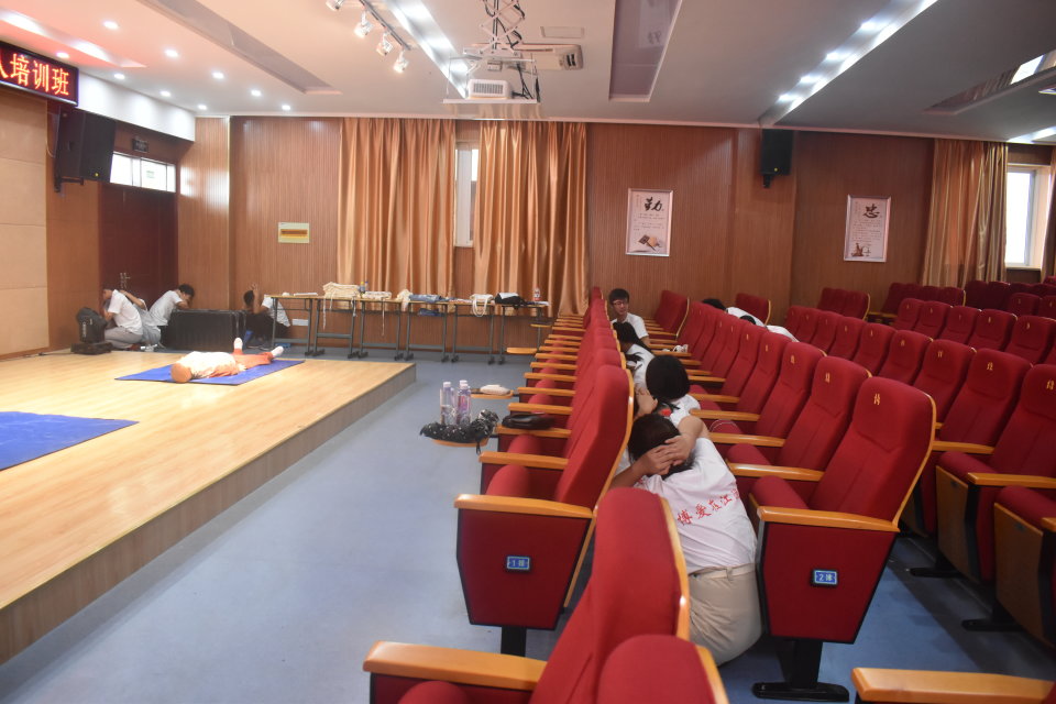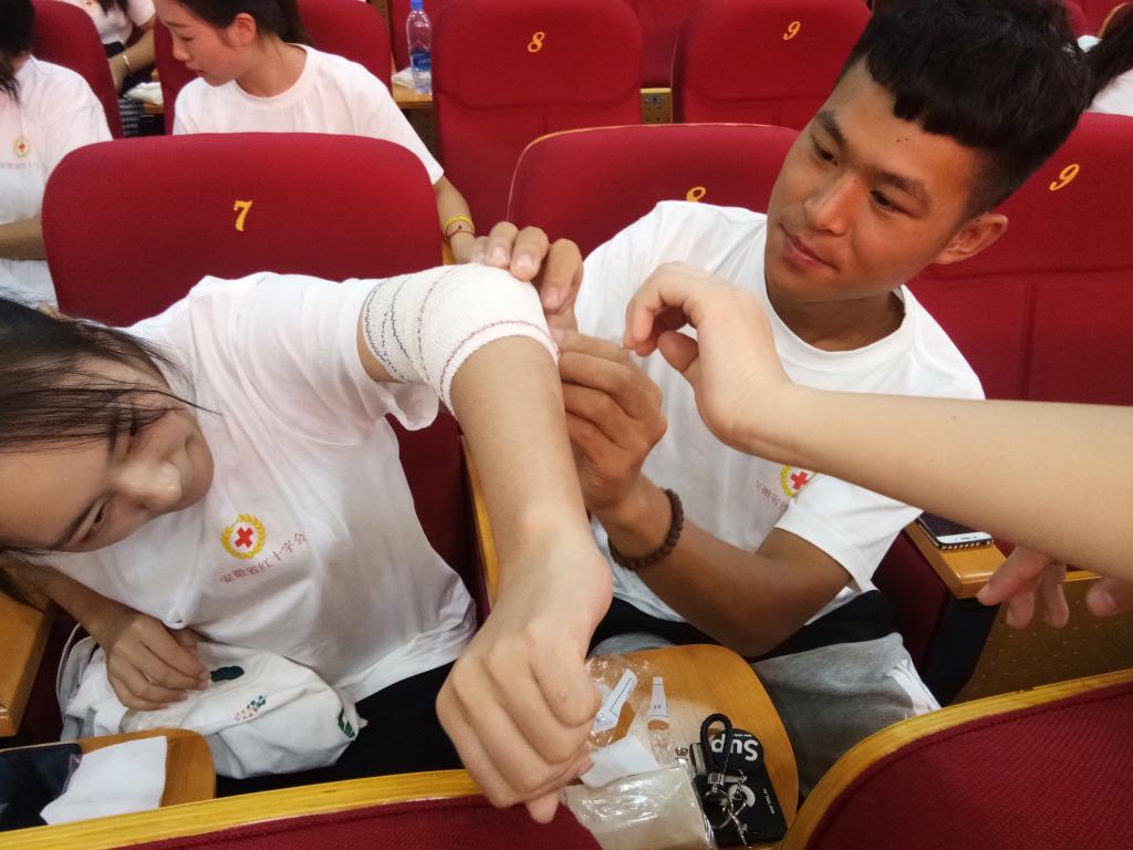 第二天,李敏老师首先为红十字志愿者们讲解了各种情况下的创伤包扎和搬运伤员的实际操作,紧接着志愿者们两两结合,互为救助者和伤员进行练习。