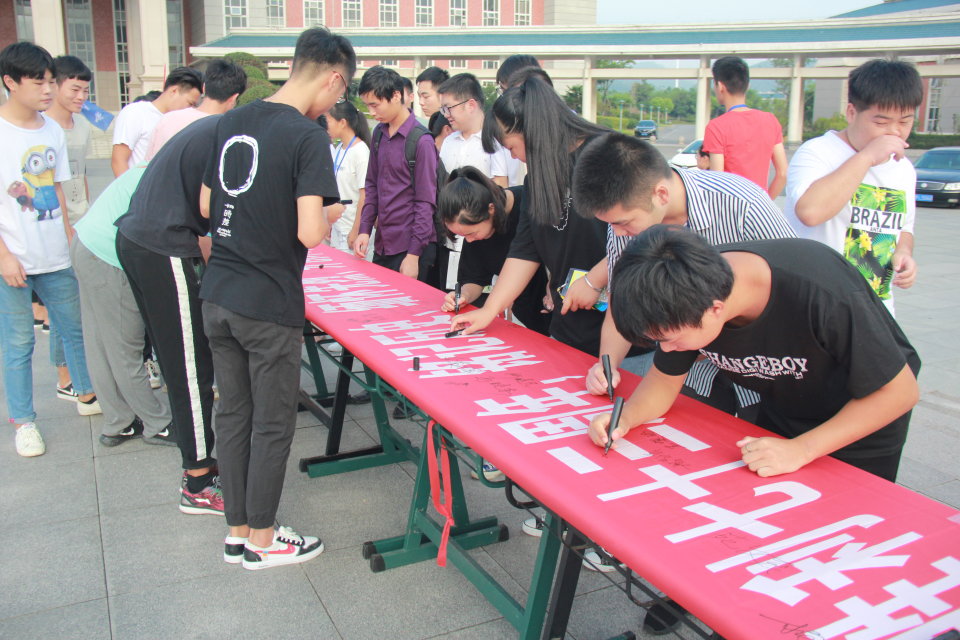 升旗仪式结束后,同学们在“纪念中国人民抗日战争胜利七十三周年,铭记历史,缅怀先烈,开创未来”横幅上签名,并表示将铭记抗战先烈的英雄事迹,认真学习文化知识和军事技能。