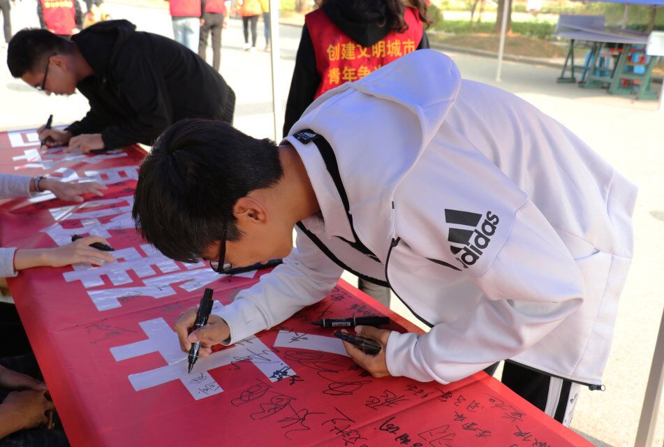 活动现场,志愿者们向过往同学们宣传“做文明学生 创文明校园”倡议书,号召广大师生自觉参与到文明校园和文明城市创建中来,遵守市民文明公约,维护城市公共秩序,搞好学校社区环境卫生;关爱弱势群体,传递社会正能量。大家在横幅上郑重地签下了自己的名字,也表达了创建文明校园的决心。