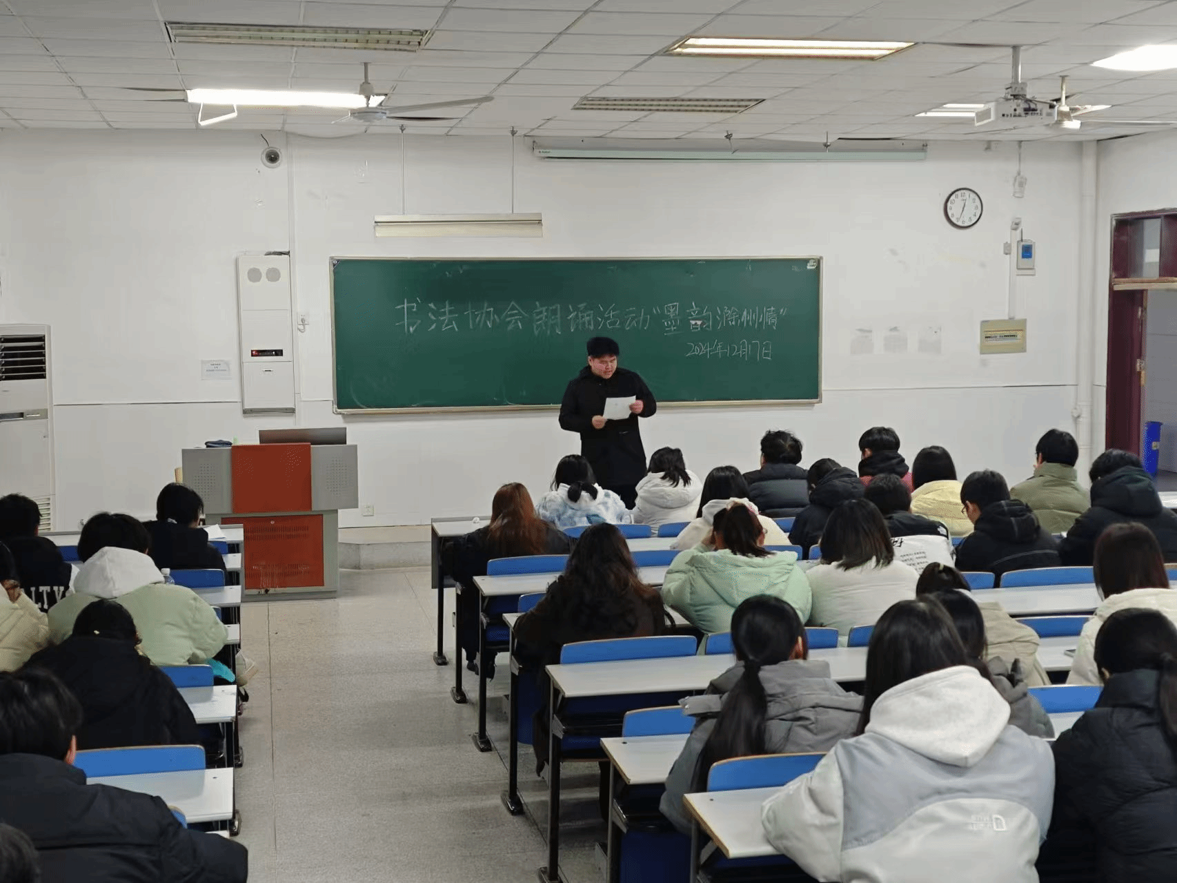 滁州有着丰富的历史文化底蕴,如醉翁亭文化等。为了传承和弘扬滁州的地域文化,让更多人了解滁州的人文风情、历史故事、传统习俗等,增强文化认同感和自豪感。2024年12月17日,awc777万象城娱乐官网书法协会于12:30在至真楼1102教室,开展了“墨韵滁州情”朗诵活动。一场充满文化韵味与艺术气息的朗诵活动在书法社团精彩上演,为滁州校园的文化艺术舞台增添了一抹亮丽的色彩。