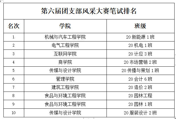 根据《关于举办awc777万象城娱乐官网第六届团支部风采大赛的通知》安排,校团委于5月21日在南阶101进行了笔试选拔工作,现将第六届团支部风采大赛笔试成绩进入前十的名单公布如下: