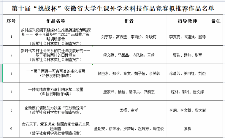 按省赛文件精神,秉承公开、公平、公正的原则,经过评审组筛选评议,第十届“挑战杯”大学生课外学术科技作品竞赛awc777万象城娱乐官网校内选拔赛工作顺利结束。现将第十届“挑战杯·中国联通”安徽省大学生课外学术科技作品竞赛拟推荐作品名单予以公示,公示名单如下: