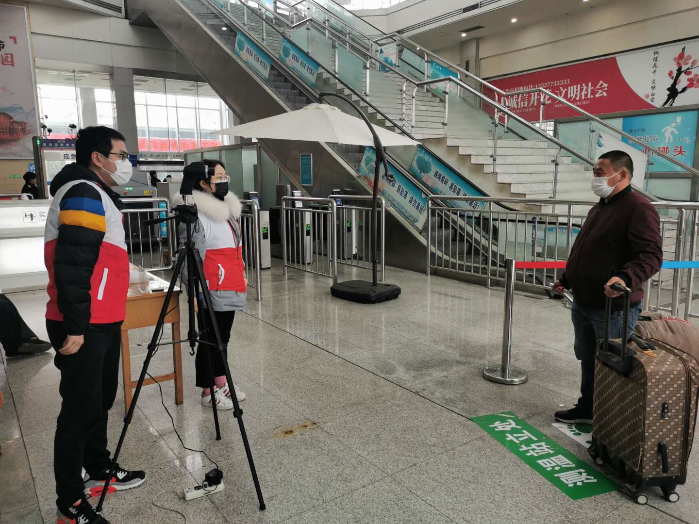 随着返程复工流的到来,车站的人流量明显多了不少,铁路作为疫情防控的“出入关”,为了守护好这“第一道”防线,3月1日,校团委的5位年轻老师来到滁州北火车站,加入了志愿者服务队伍。他们分成两组,一组负责在进出站口检测旅客的体温,另一组在检票闸机前作为引导员。测量体温虽然是一项简单的工作,但由于巨大的人流量,志愿的老师需要不停的提醒旅客站在指定位置接受体温测量,另一组的老师们在检票闸机前耐心引导旅客顺利通过人脸识别系统进站。