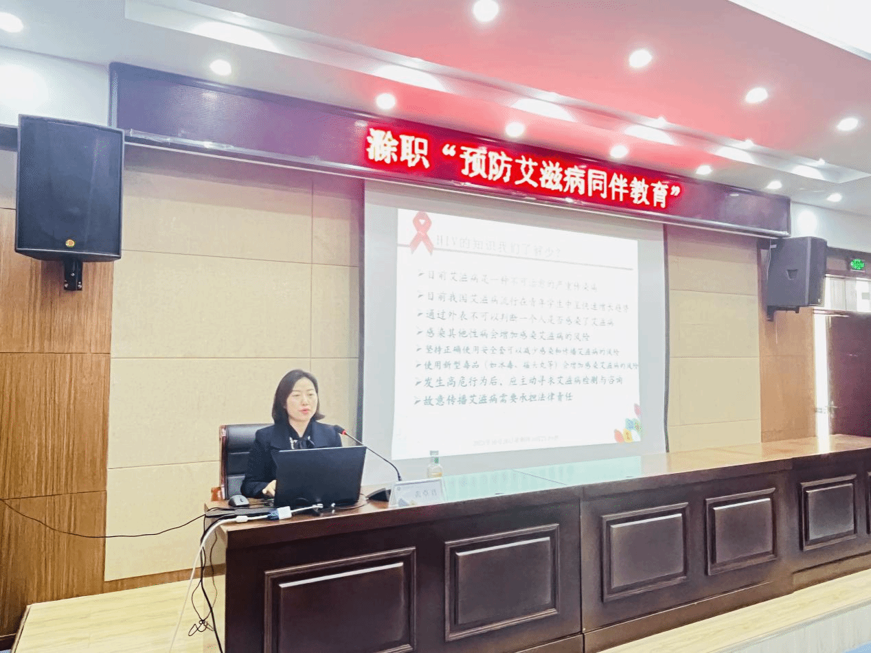 讲座过程中,黄科长介绍了什么是艾滋病,艾滋病的传播途径及临床表现,科普了艾滋病的危害,让同学们直观地感受到了防治艾滋病的重要性和必要性。同时鼓励同学们在保护好自己的同时,承担起一定的社会责任,理解和善待艾滋病患者。