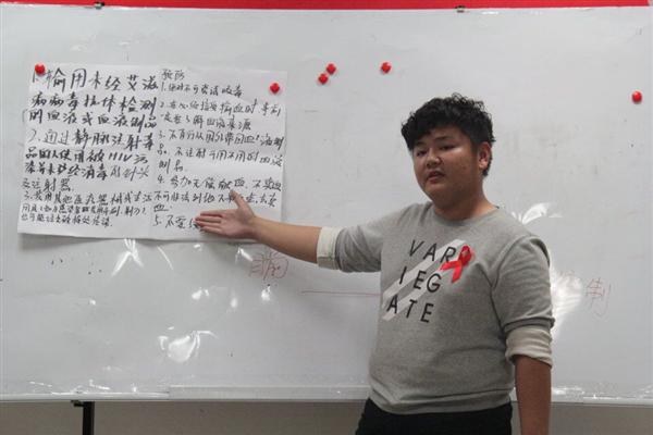 在第二天的培训中,孙宁老师进行了“同伴压力”,各个小组分别模拟了在各个场景如何委婉的拒绝吸烟喝酒和毒品,为同学们播放了预防艾滋病宣传片《老乡帮老乡》。身体力行地宣传艾滋病不会通过日常接触传染。下午,孙宁老师提出的condom演示,同学们认真地跟着老师学习安全套的使用步骤,积极地参与进来。最后,培训临近结业,每位同学手持一只蜡烛围成圈,听老师讲了预防艾滋的重要性以及满是希望的前景,述说了自己这几天的收获,表示通过这几天的学习,自己对防艾知识都有了很大的了解。