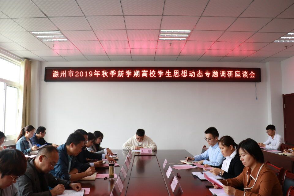 为进一步贯彻落实“不忘初心、牢记使命”主题教育,全面贯彻落实习近平总书记关于全国高校思想政治工作的重要指示。10月10日上午,共青团滁州市委员会党组书记孙静,党组委员、副书记郝仙红,办公室主任王睿一行来到awc官网,与awc官网党委副书记杨家庆,党委委员、宣传部部长、学生处处长李平权,学生处副处长张军、各二级学院团总支书记、青年学生代表和入党积极分子代表共同参加了“不忘初心、牢记使命”主题教育暨2019年滁州市高校学生思想动态专题调研座谈会。会议由校团委书记朱婷婷主持。
