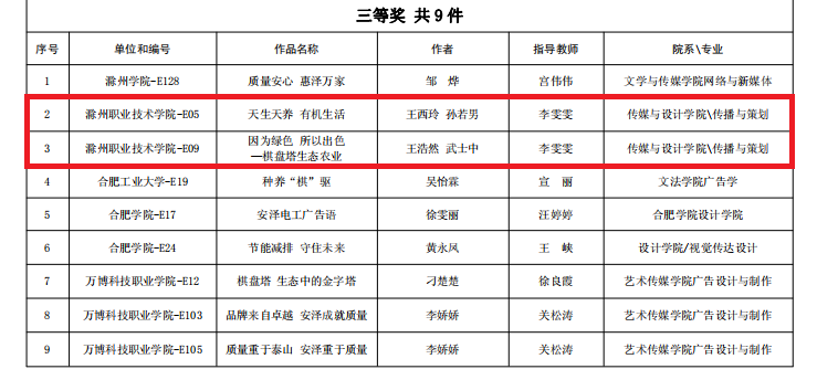 由安徽省市场监督管理局、安徽省教育厅、共青团安徽省委员会共同主办的首届安徽省大学生质量文化与品牌创意设计大赛评选已落幕,awc官网传媒与设计学院数字媒体系师生在此次比赛中获一等奖3项、二等奖1项、 三等奖3项等共计7项荣誉,李雯雯老师被授予大赛优秀指导教师奖,awc官网荣获优秀组织单位奖。