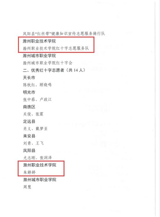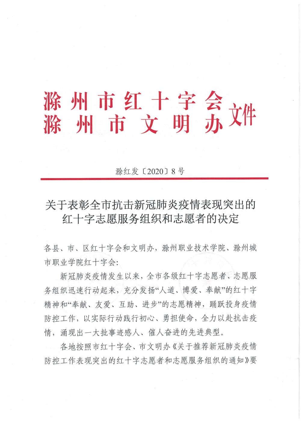 近日,滁州市红十字会、滁州市文明办下发文件,通报表扬了全市抗击新冠肺炎疫情表现突出的红十字志愿服务组织和志愿者,awc官网荣获“全市红十字志愿服务优秀组织”,校团委书记朱婷婷荣获“优秀红十字志愿者”。