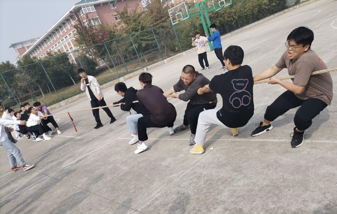 参赛队伍以学院为组别进行划分,共有10队。当比赛的哨声响起,只见参赛的队员们紧握长绳,卯足了劲拼命往后拉!未参赛的同学自发组成啦啦队为比赛队员呐喊加油,哨子声、呐喊声此起彼伏,现场激烈的比赛将整个活动推到了高潮!