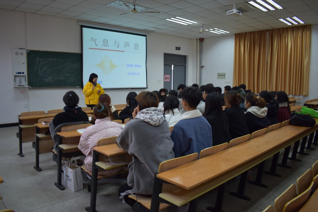 为提升学生艺术审美和人文素养水平,指导师生掌握科学的发声方法,12月16日下午,基础部在南阶103教室举办了“气息与声音”专题讲座,来自广播站、合唱团、艺术团的成员及部分教师聆听了此次讲座。讲座由王蓓蓓副教授主讲。