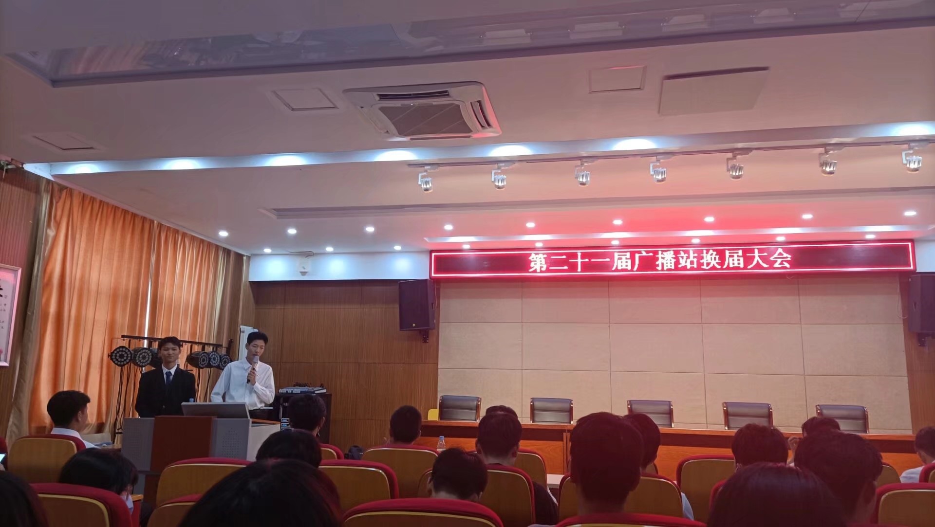 会上,第二十届广播站站长胡誉首先代表广播站欢迎各位老师以及同学们的到来,并向大家宣布了第第二十一届广播站站长及副站长名单。胡誉讲话结束后,新任站长李浩以及新任副站沈俊豪做了就职演说和工作展望。两位新任站长的发言让老师以及站员们看到了他们对工作的认真负责。