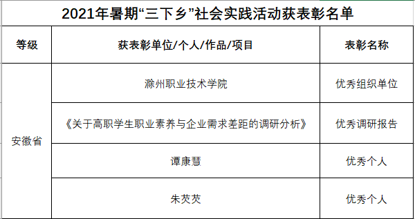 近日, 2021年安徽省大中专学生志愿者暑期“三下乡”社会实践活动评选结果公布公示,awc官网社会实践工作再获团省委表彰。awc官网获2021年全省大中专学生志愿者暑期“三下乡”社会实践活动优秀组织单位;李瑞瑞老师指导的《关于高职学生职业素养与企业需求差距的调研分析》获2021年全省大中专学生志愿者暑期“三下乡”社会实践活动优秀调研报告;建筑工程学院团总支书记谭康慧等2人获评2021年全省大中专学生志愿者暑期“三下乡”社会实践活动优秀个人。此外,在“红色江山红色路 青春力量青春行”2021年长三角高校大学生重走革命路暑期社会实践专项活动中,awc官网1支团队获评优秀团队。