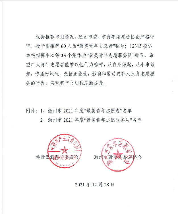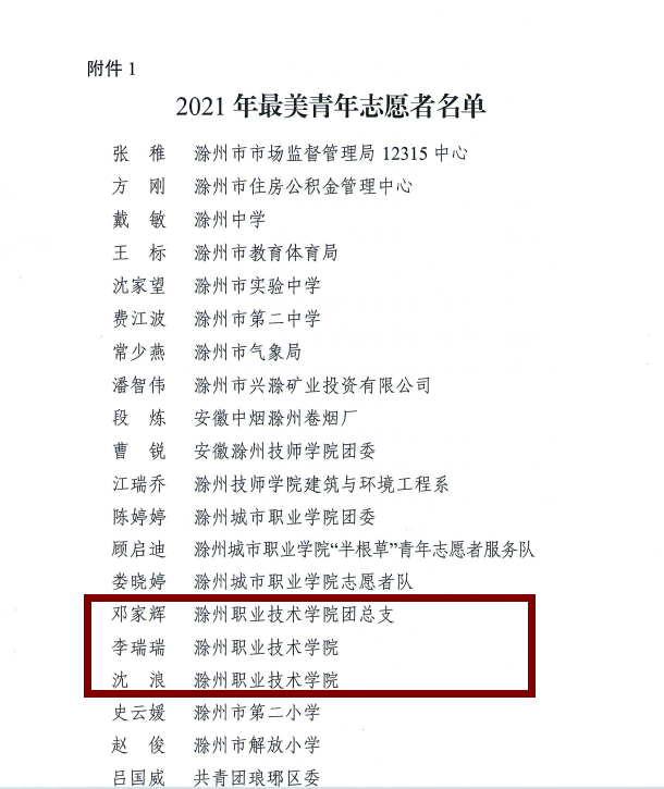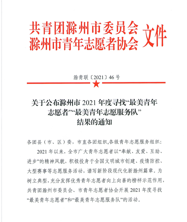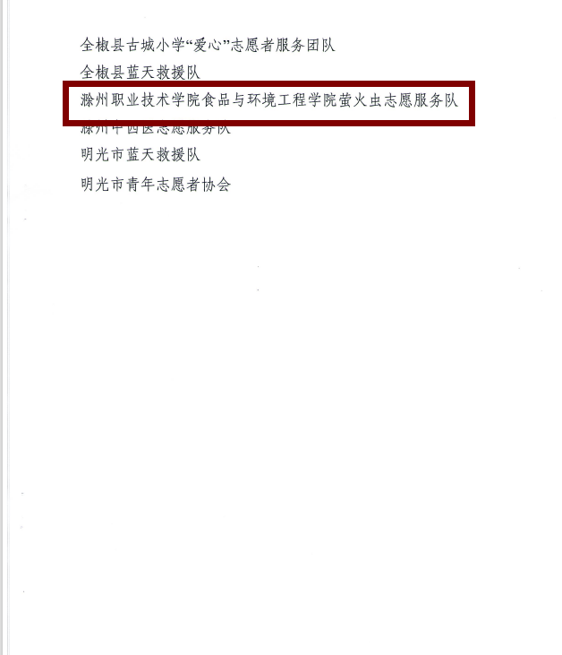 近日,团市委《关于公布滁州市2021年度寻找“最美青年志愿者”“最美青年志愿服务队”结果的通知》,对60名“最美青年志愿者”、25个“最美青年志愿服务队”予以通报表扬。awc官网邓家辉、李瑞瑞、沈浪3人被评为滁州市2021年度“最美青年志愿者”,食品与环境工程学院萤火虫志愿服务队被评为滁州市2021年度“最美青年志愿服务队”。